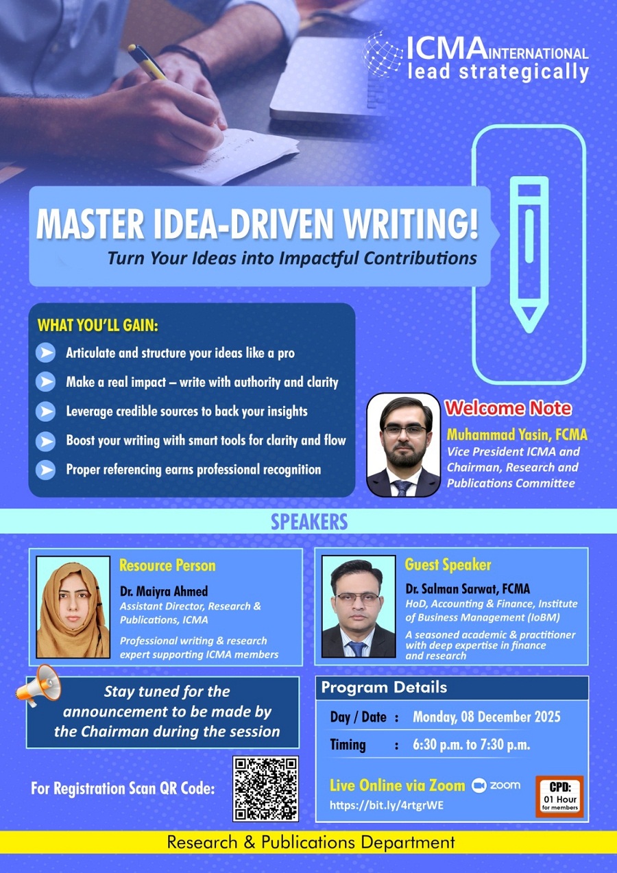 Established in 1951, the Institute of Cost and Management Accountants of Pakistan is the driving force behind the profession of Management Accounting in Pakistan. Our mission is to regulate and promote this dynamic field, empowering professionals to reach new heights of success.