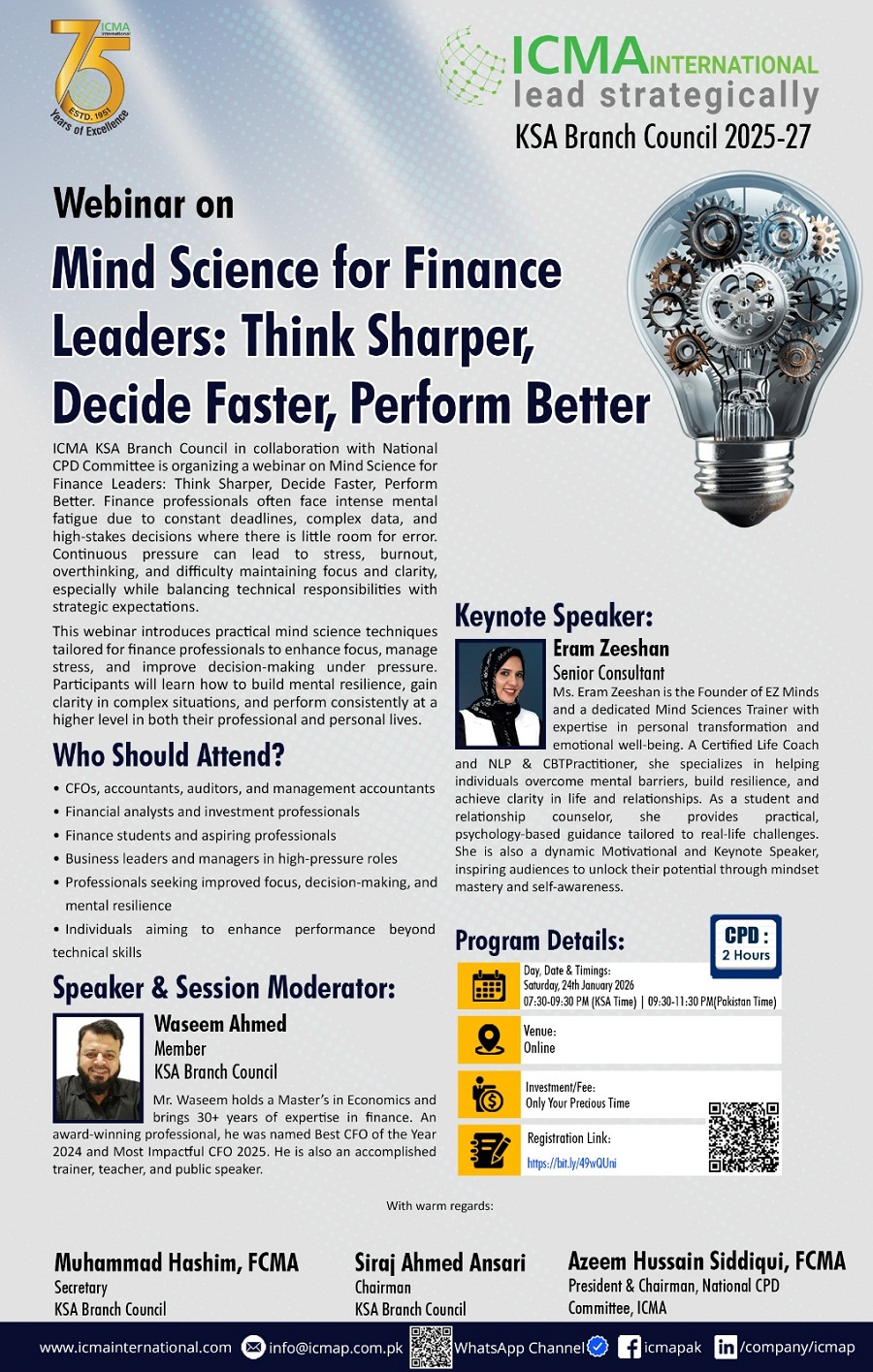 Established in 1951, the Institute of Cost and Management Accountants of Pakistan is the driving force behind the profession of Management Accounting in Pakistan. Our mission is to regulate and promote this dynamic field, empowering professionals to reach new heights of success.
